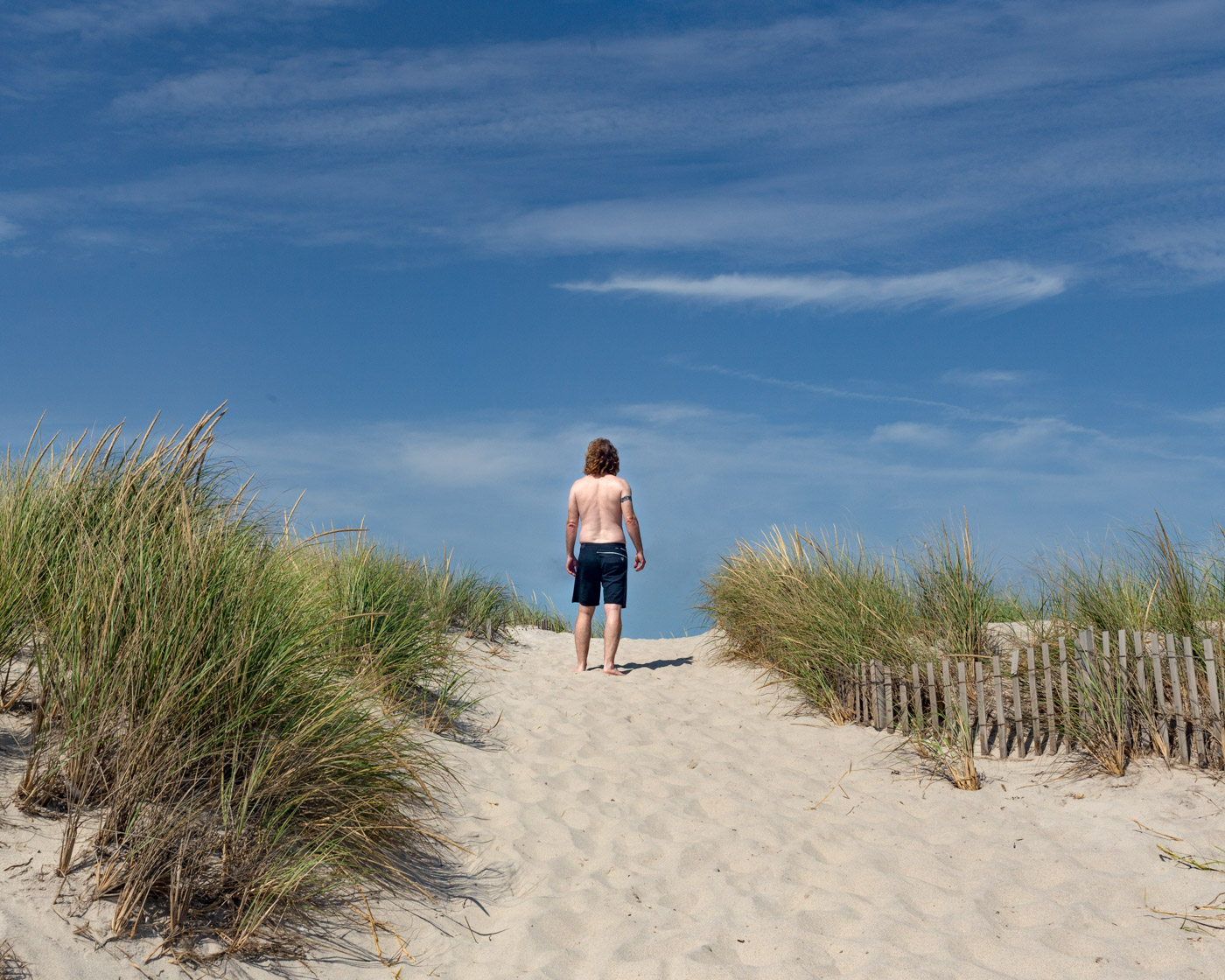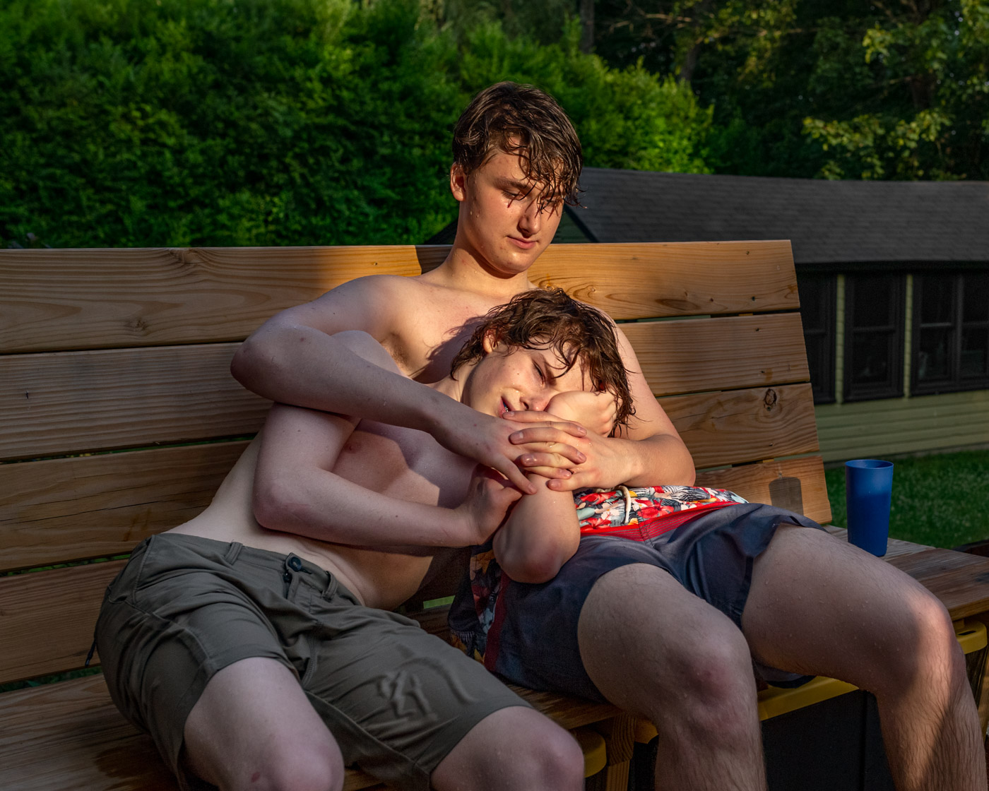 In my series Hold Me Tight, I explore moments of intimacy and vulnerability between my husband and two teenage sons, often while on family vacations in nature. A kind of sensory aliveness takes hold and I see their changing bodies, in adolescence and midlife, register so much feeling. The sculptural quality of their forms reminds me of early ideas of classical beauty, and the stories and struggles of manhood in Ancient Greek myth. Their physical interactions too, distilled in a photograph, reveal heightened tensions of closeness that are familiar scenes throughout the history of Western art, yet speak to a resonance I might not otherwise see in daily life or in contemporary representations of male relationships. Inspired by art history, psychology, and Greek myth, I explore the question of whether there exists an inherently masculine experience and reflect on the biases of our own cultural moment of narrow societal ideas of manhood. And standing just outside their intimate circle, I often recognize myself in these moments, the masculine and feminine within each of us, by holding up these tensions in the light.