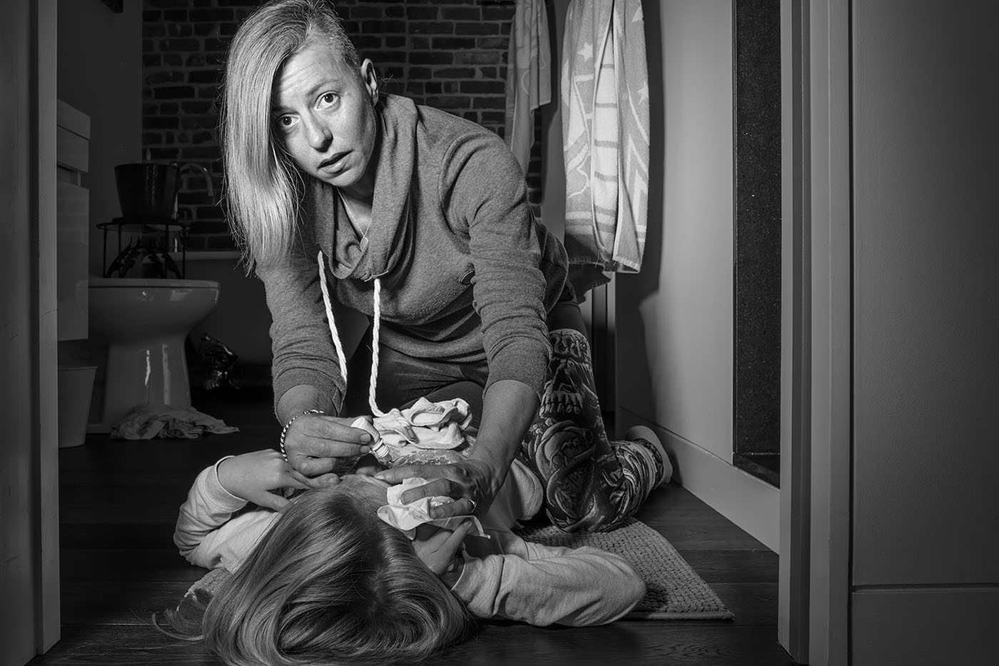 When my daughter was born, I was told that she had the “physical markers” for Down syndrome. A few days later, the diagnosis of Trisomy 21 was confirmed with a simple blood test. Today, sixteen years later, Luigia is a lively teenager, yet these “markers” have grown with her, and her disability remains visible to the outside world. As we try to go about our ordinary lives in our community, I often catch people staring, gawking, or side-glancing at her, at us. With this on-going series REGARD, I am opening a window into our reality. To emphasize control over my message, these everyday scenes are meticulously set, lit up; they are staged and posed. The performers are my daughter and I. The portraits are purposefully developed in black and white, for by refusing the decorative and emotionally evocative element of color, I aim to maintain a distance between us and them. The composition of the photographs expresses routine, domestic acts in which I address the viewers directly: look at us bathing; look at us grooming; here we are at bedtime; this is us on a random day at the beach. In each scene, the viewers are plunged into the outside perspective. At first glance, it may seem that I am offering us as vulnerable prey to their judgement, yet in fact I am guarding our lives, and the viewers are caught gawking--my direct gaze at the camera. My series is very basic in its concept: it shows a child, it shows a mother, it shows them living at home, performing familial acts. Because I believe in the connective power offered by the depiction of domesticity, I hope that REGARD helps the audience rethink some of their assumptions about people living with disabilities and with this, I hope my series finds a humble spot within the movement that helps people with disabilities gain visibility.