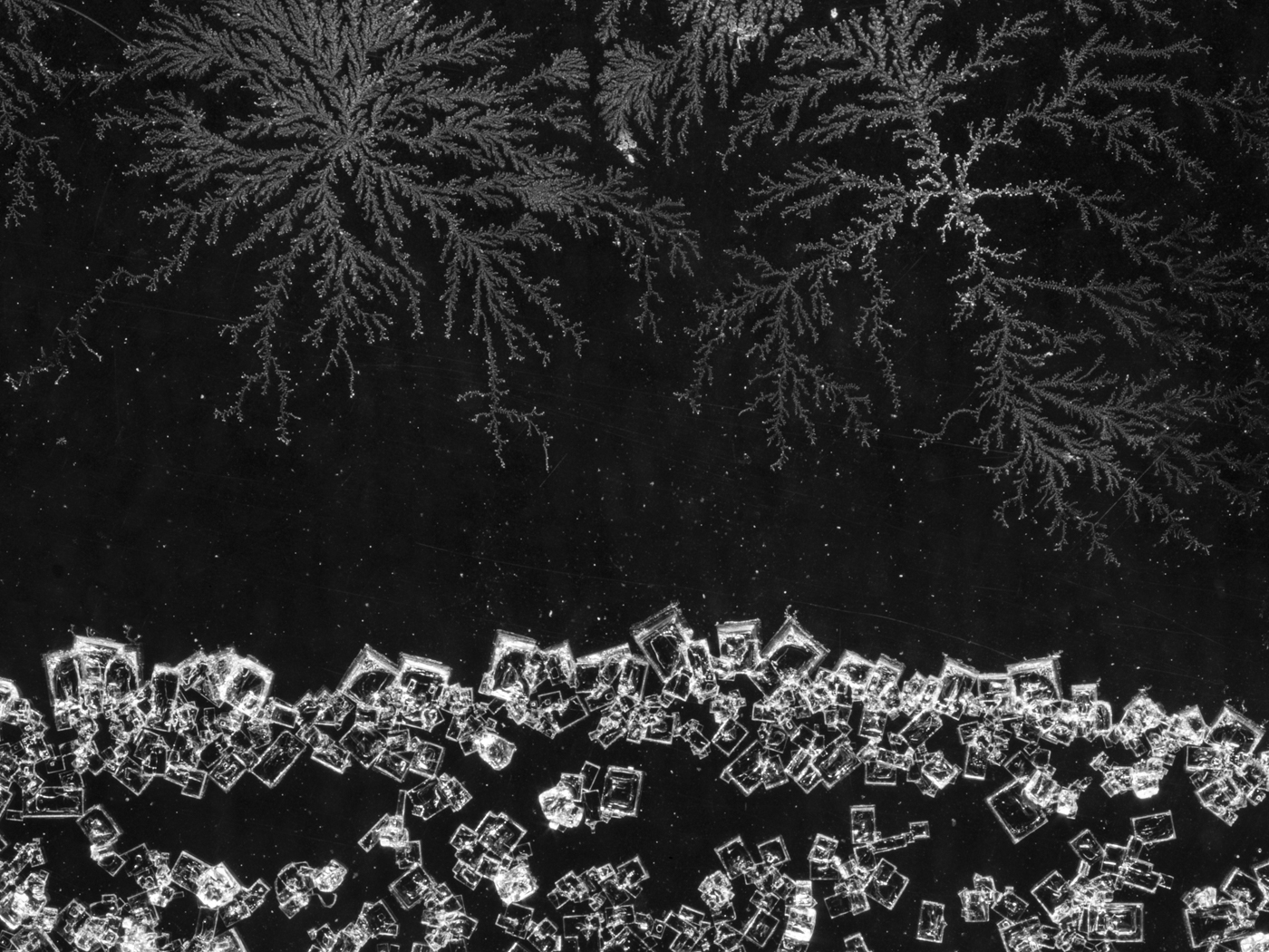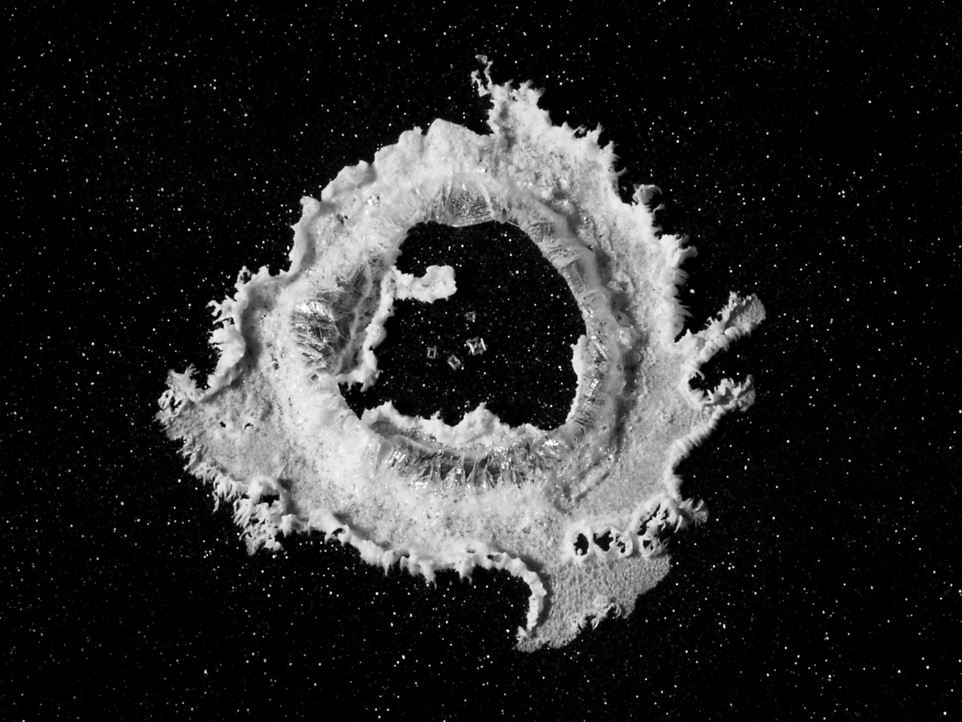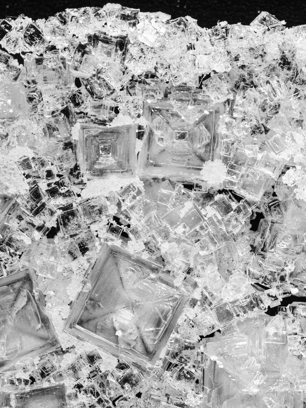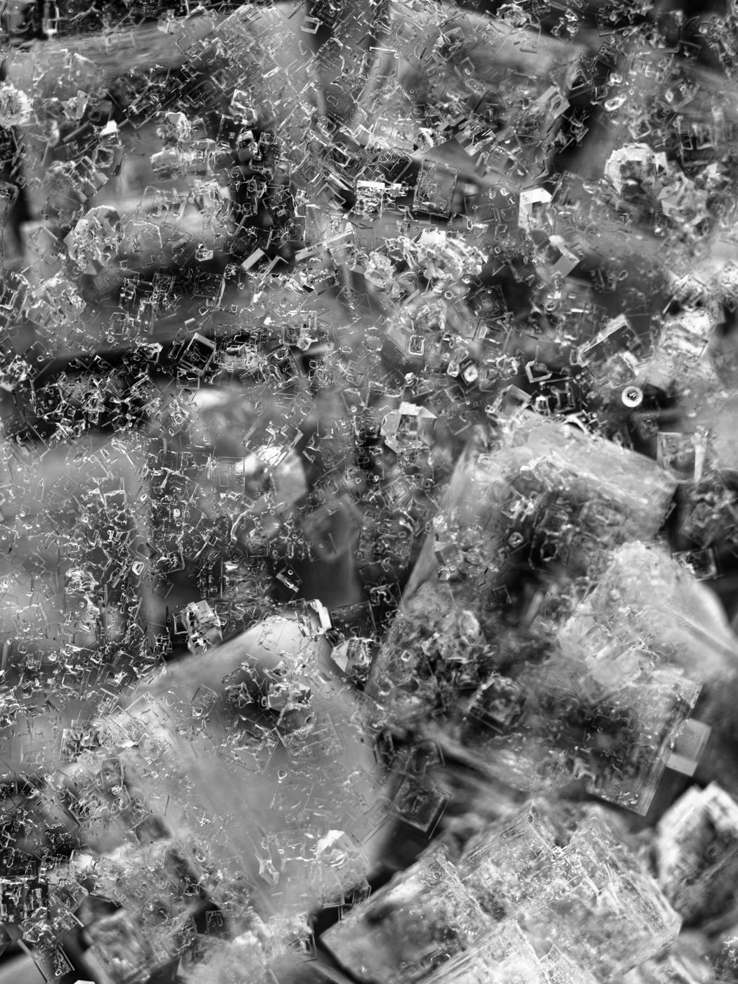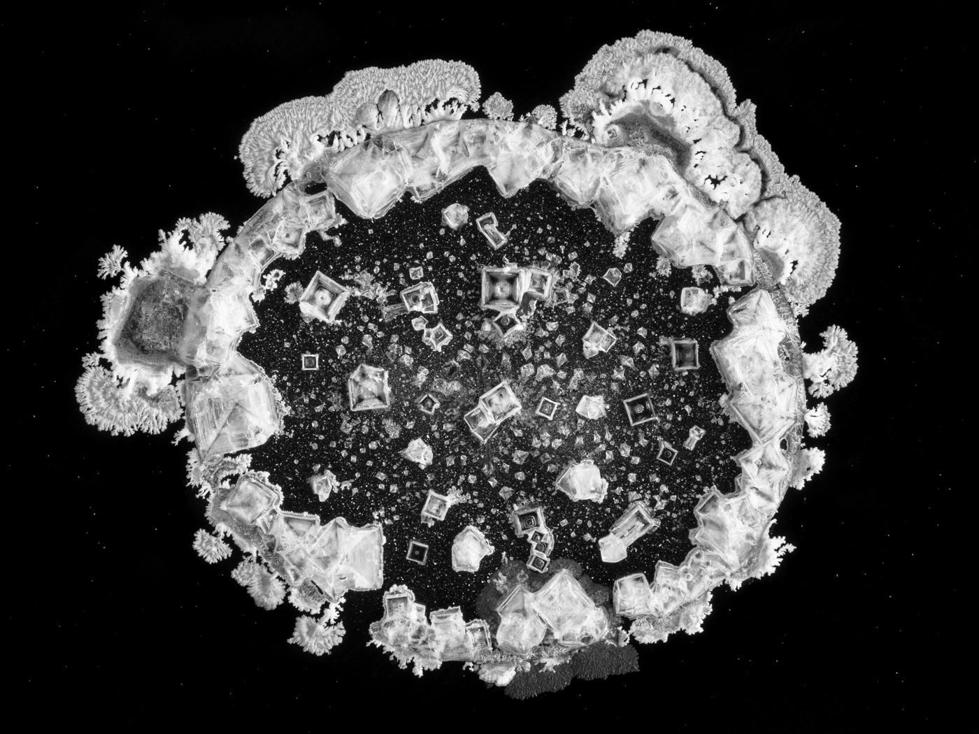 Salt is the commonest of common things. Essential as it is to human lives, salt finds its place in countless metaphors. We can taste it when we can’t see it, in our tears, on our skin; it makes us thirsty if we have too much. As a mineral in the world, it has a sort of life of its own. Left to its own devices, salt fluctuates between visible and invisible, organizing itself into structures and patterns, and dissolving again. Under ideal circumstances, the mineral settles into clean-edged structures that maintain clarity and precise right angles as they grow. But circumstances are rarely ideal. Fluctuations in temperature or humidity, an occasional jostle, or pollution in the water will disrupt the crystal formation. Any state we witness is a moment from a process of becoming, and our own mutable nature is there, in crystals that never quite reach an ideal form.