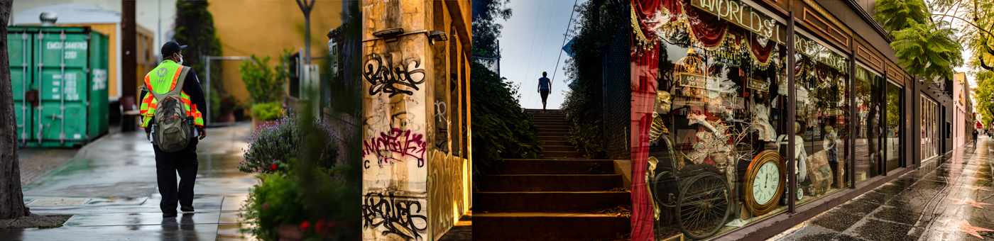In the often chaotic and overwhelming pace of life, I use my camera to create a non-linear diary of the places and experiences that have been imprinted on my psyche. The creation of my extended frame format has allowed me to more completely convey a visual narrative of the overly stimulating multi-sensory experience felt across urban environments. These individual photographs - and the subjects within them - are placed in conversation with each other to explore dichotomies of public vs. private, unity vs. isolation, the collective vs. the individual. The resulting scenes transport the viewer to new, imagined environments even as visual inconsistencies disrupt the illusion where two frames meet. Simultaneously both distinct and interlinked, these images reveal unexpected connections, challenging our idea of what is real and reflecting on the unpredictable, idiosyncratic, and inscrutable nature of the human experience.