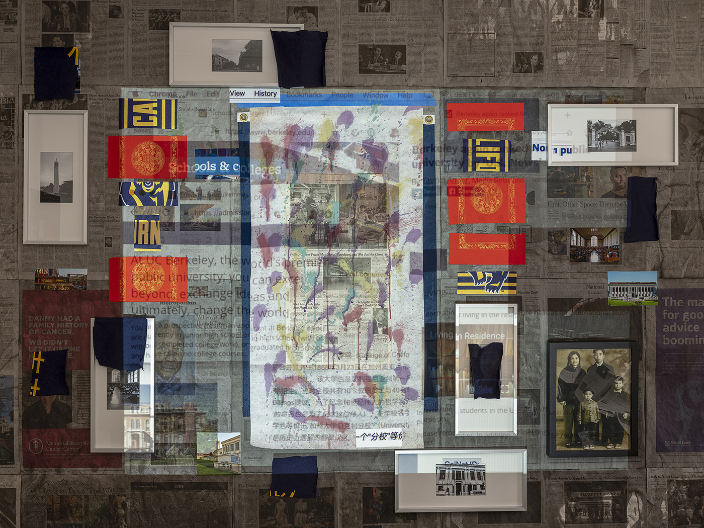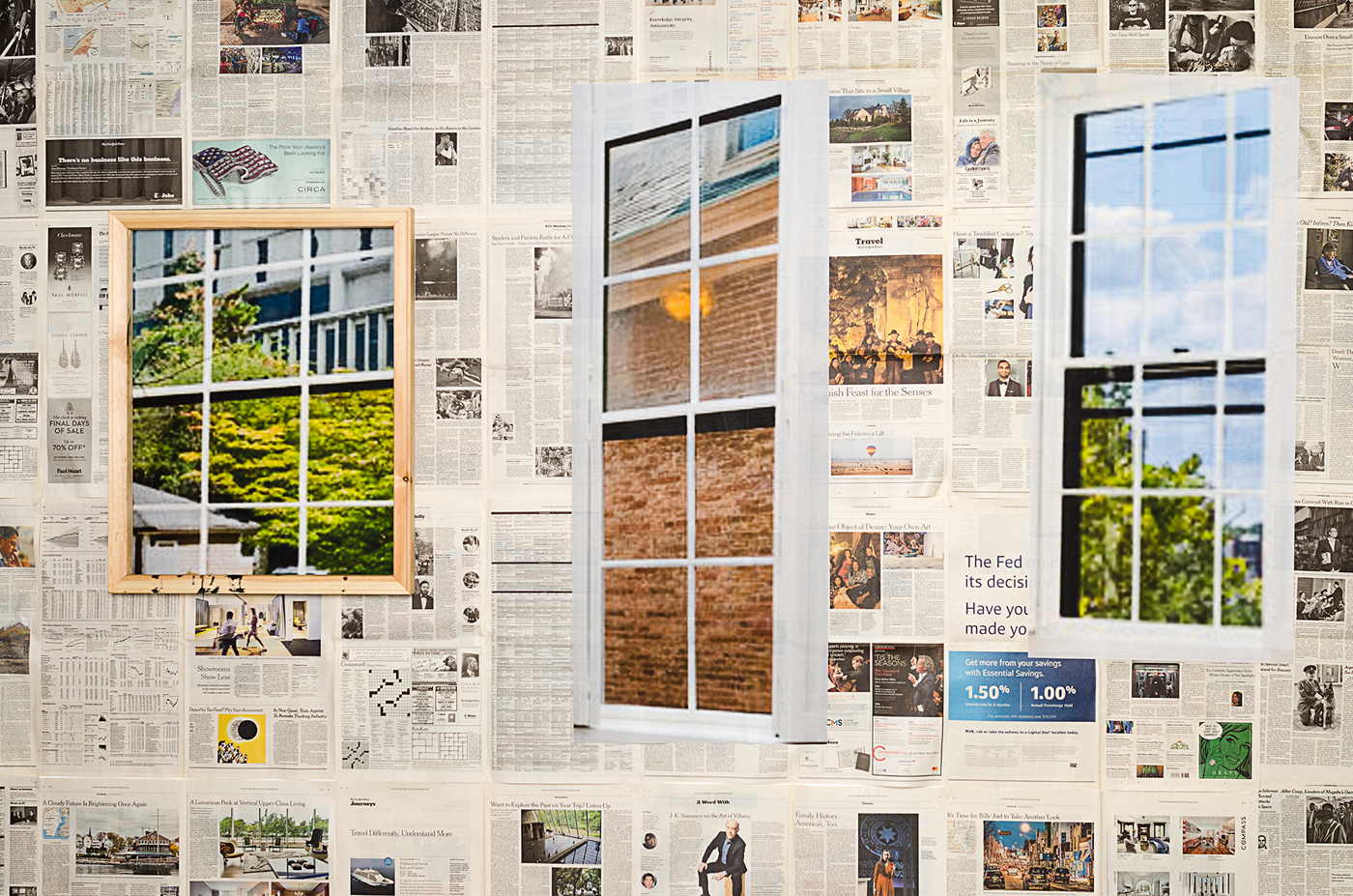I call this series “Wallpapers” because it evokes the common practice forty years ago of pasting newspapers on the walls of one’s home, a handy and affordable solution for wallpaper in China. I am only using The New York Times due to The Times routinely reports what is happening within China and its website even has a Chinese language version. I use both online images and personal images to highlight subjectivity and objectivity. The newspapers are black/dark colors because I soaked in traditional Chinese watercolor ink before. The newspapers are yellow because I soaked in photographic developer before. Because I was not an international student anymore, I am currently researching and creating the perfect photographic space for new Chinese immigrants including myself after taking education in the States. On the Times Chinese language website, which is one of only three language versions including English and Spanish, there is a fixed, permeant, and keeping updated photo column showed what kind of house you could get in the States wide if you could pay $250,000, 500,000 or 1million, etc.? So, I downloaded and printed out those houses pictures, then I applied those fragments of houses pictures in my work-in-process.