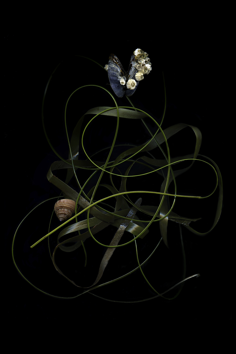 My artistic practice seeks to engage in a critical examination of human relationships with the natural world and how ecosystems are changing in our current era, by imagining and creating possible nearfutures and future landscapes. Adopting and adapting the practices of scientific investigators, I collect specimens following ethical foraging practices from natural environments. I spend time investigating ecosystems and the connections within them, particularly via site visits and consultation with scientists and lay experts. I then produce large-scale still life images using a high-resolution scanner as my camera: the specimens collected from each site are arranged together on the glass, composing intimate portraits of ecosystems. The photographs, printed at a very large scale on a smooth, matte paper, exhibited unframed, allow the viewer to get an unusually close look at each object. The images are elegiac, dark, mourning, representing not contemporary specimens but rather, recontextualized, some last remaining pieces of a fragmented world, floating in the void, evoking a sort of future nostalgia.