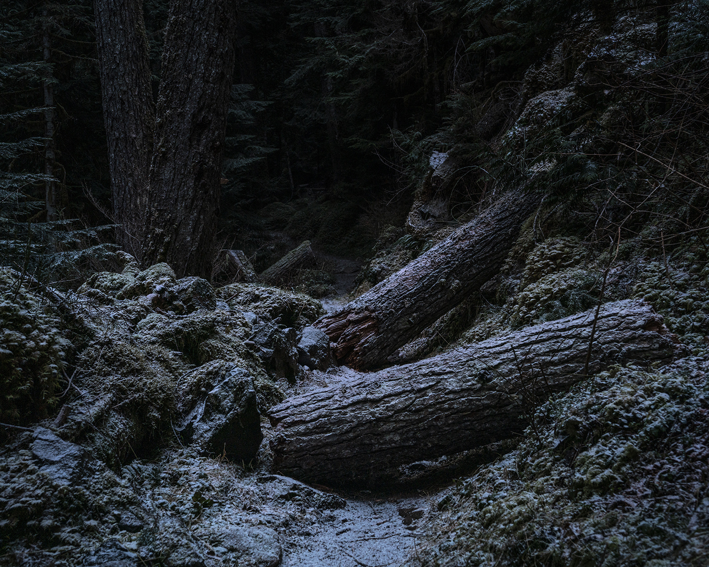 "Pseudo Night" utilizes photography to explore the representation and sublimation of walking through a landscape. This photographic series meditates on the physicality of walking, interpretation of my surroundings, and how those two ideas correlate. These images are an immersive experience of what it is like to travel through time and space. I photograph during the day to represent nights-capes. This approach is influenced by old Western films that would film night scenes during the day. I use this technique to create a scene that isn’t natural. I am conceptually drawn to the idea of what is more real, an observational photograph of the trail at night, or a constructed one? What is truer to the experience and how can I relay that to my viewers? These night scenes reflect a suspended moment in time that happens during my long walks. The carving of roads and single track trails show the impact of human presence. Playing with traditional troupes in imagery, such as the Rückenfigur or presence through absence, these images both invite and caution one to the edge of the woods.
